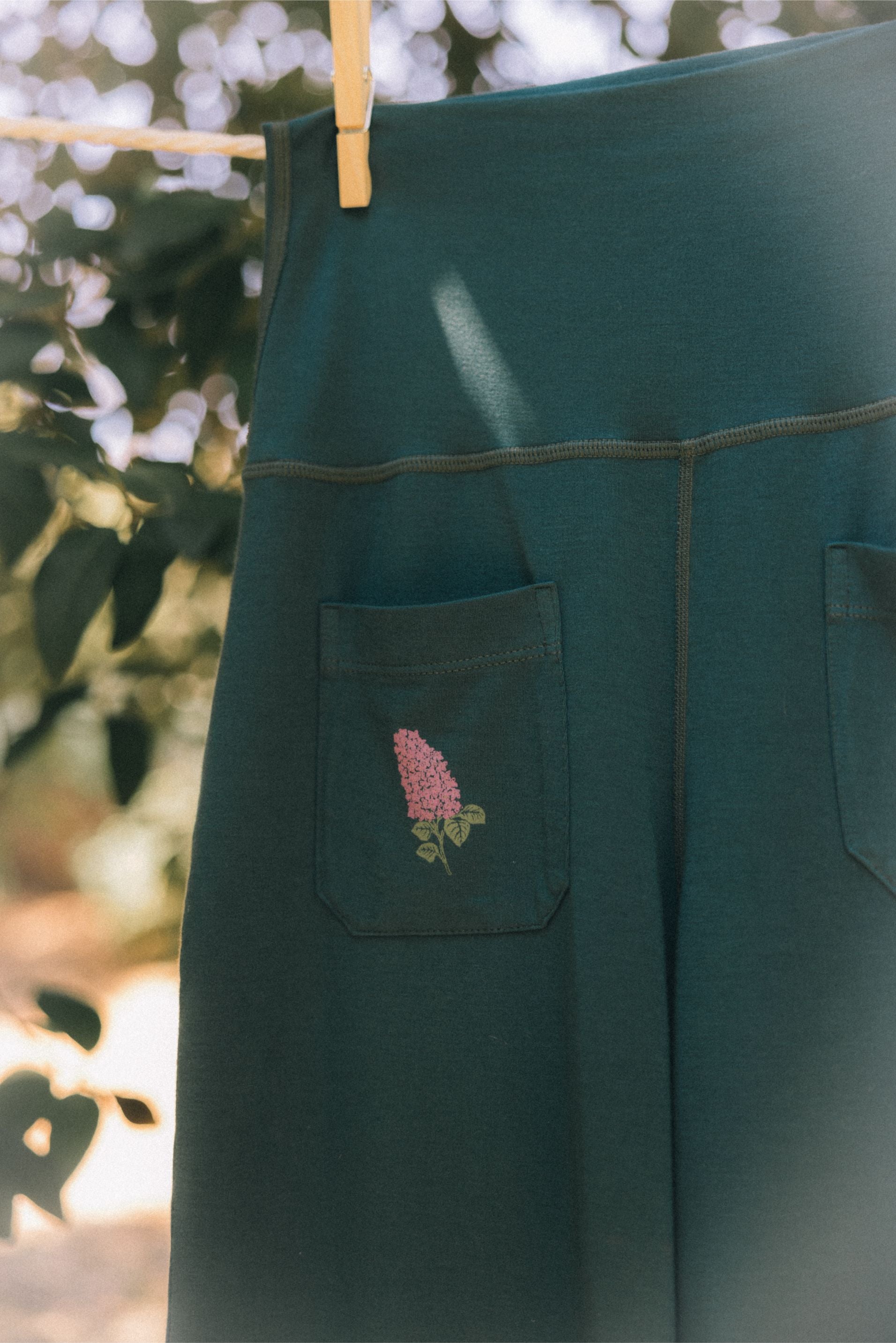 Dyed sea moss green. Lilacs printed on front pockets. Cut, sewn, dyed, and printed in downtown Los Angeles by small family owned shops where creators are paid more than minimum wage.