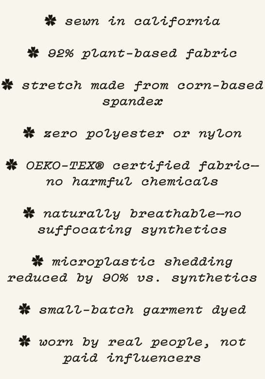Our clothing is free from polyester and traditional petroleum-based synthetics. We use plant-based TENCEL™ and a small amount of Creora® bio-based spandex for stretch- derived in part from renewable resources, but not yet fully plastic free and biodegradable. It's a step toward cleaner, safer clothing for your skin and the planet.