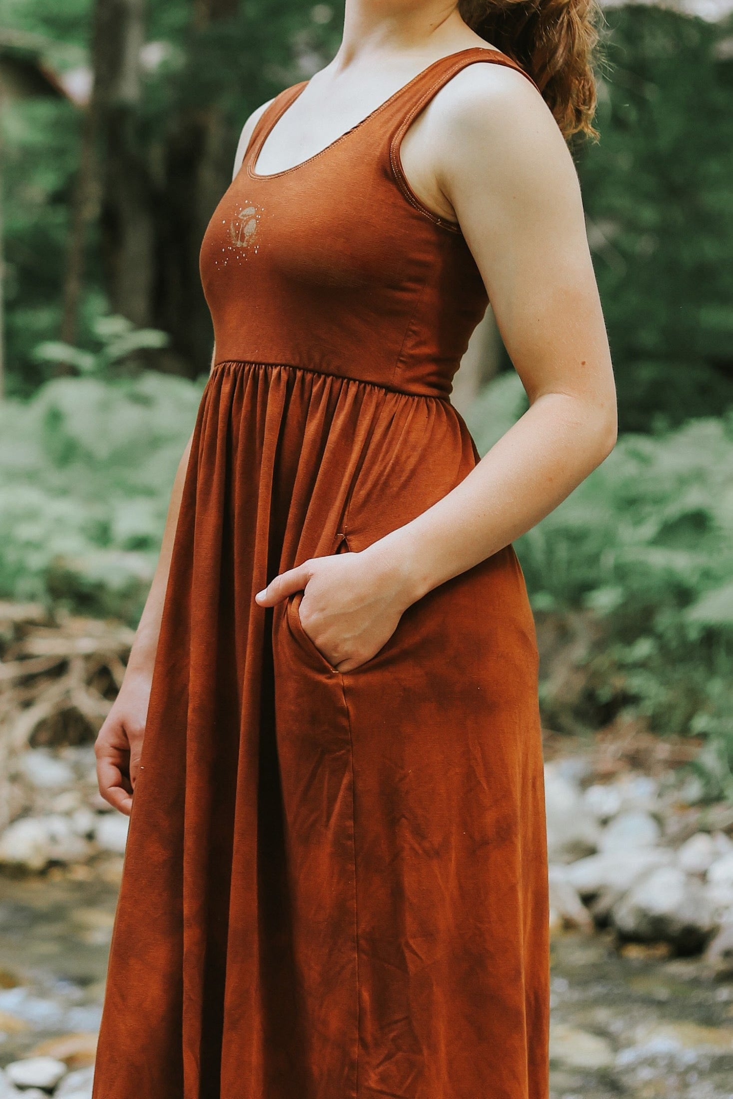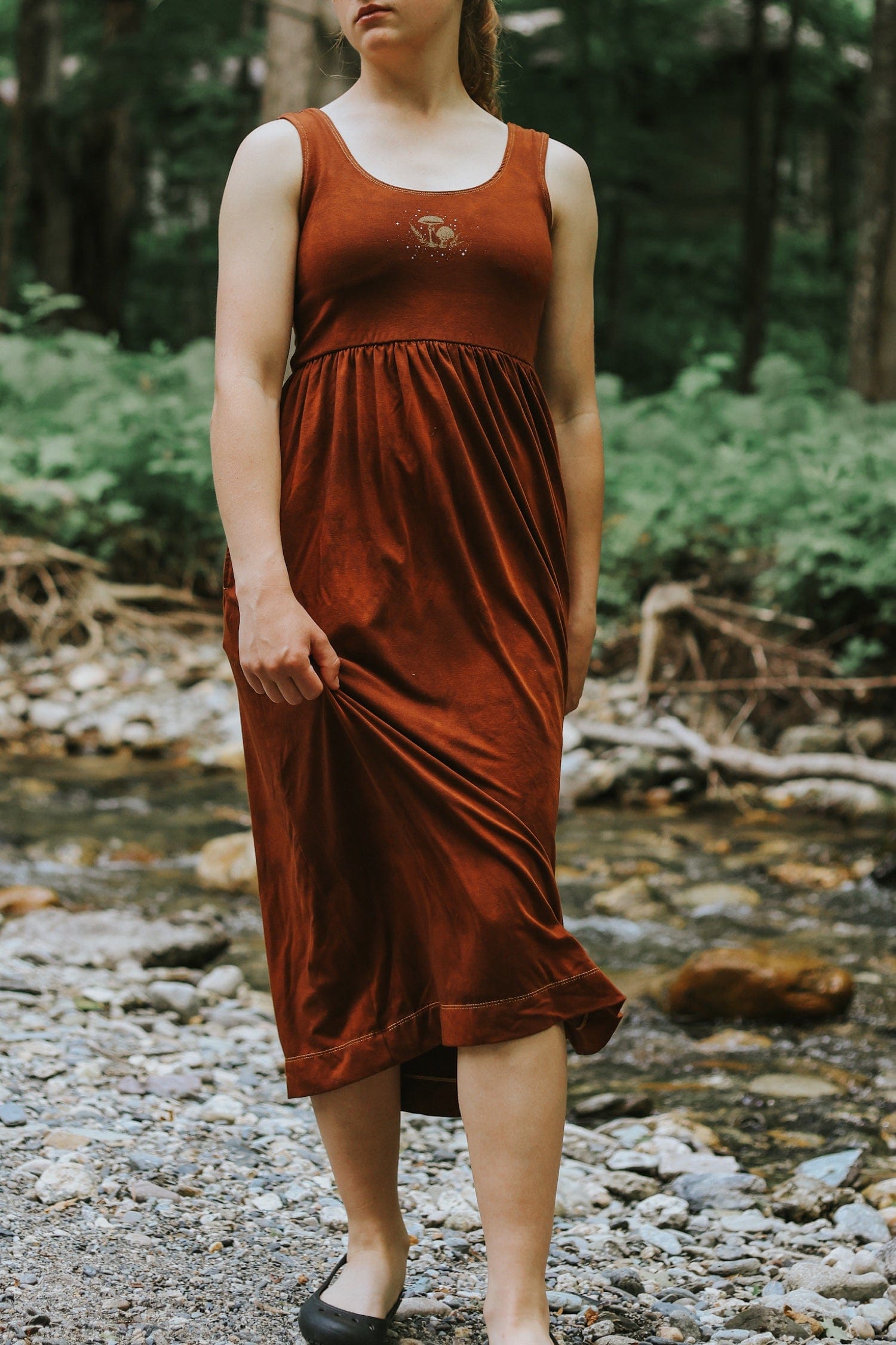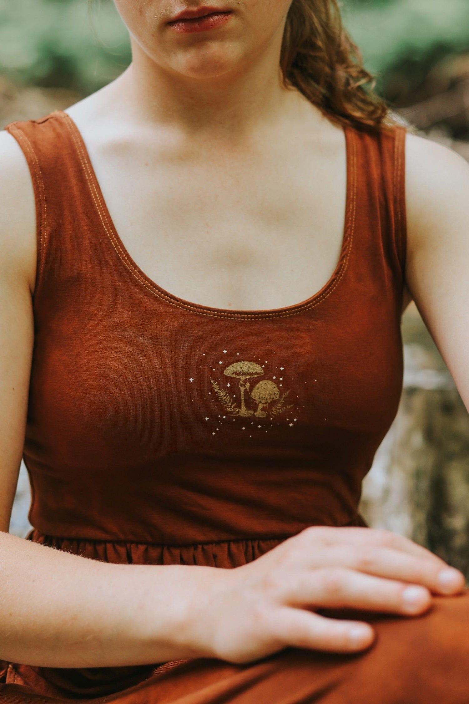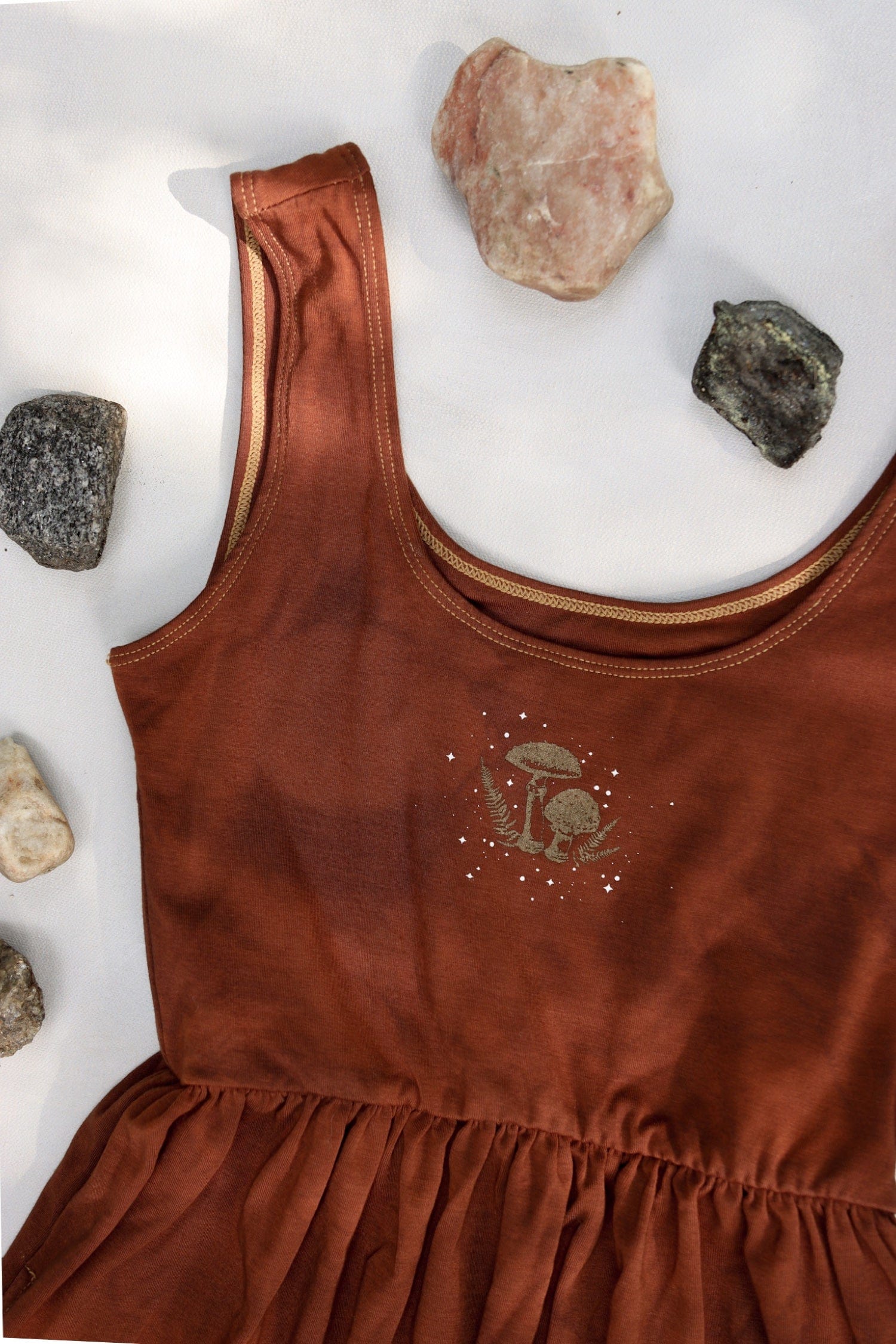 Dyed shades of warm redwood and potting soil. Golden mushrooms and white twinkles printed with water based ink on front. Cut, sewn, dyed, and printed in downtown Los Angeles by small family owned shops where creators are paid more than minimum wage.