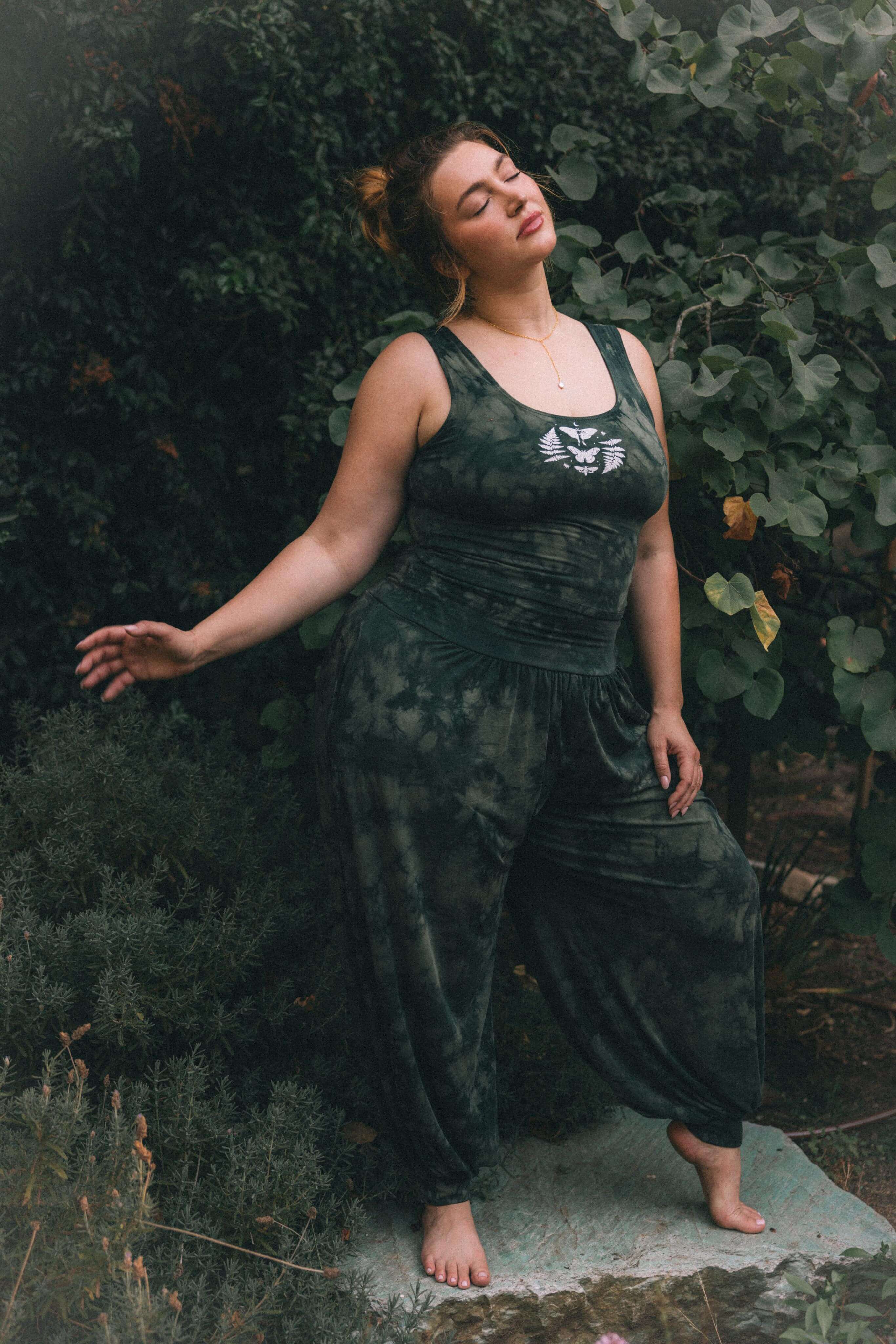 Dyed shades of forest green. White moths, ferns, and beetles printed on the back waist. Cut, sewn, dyed, and printed in downtown Los Angeles by small family owned shops where creators are paid more than minimum wage.