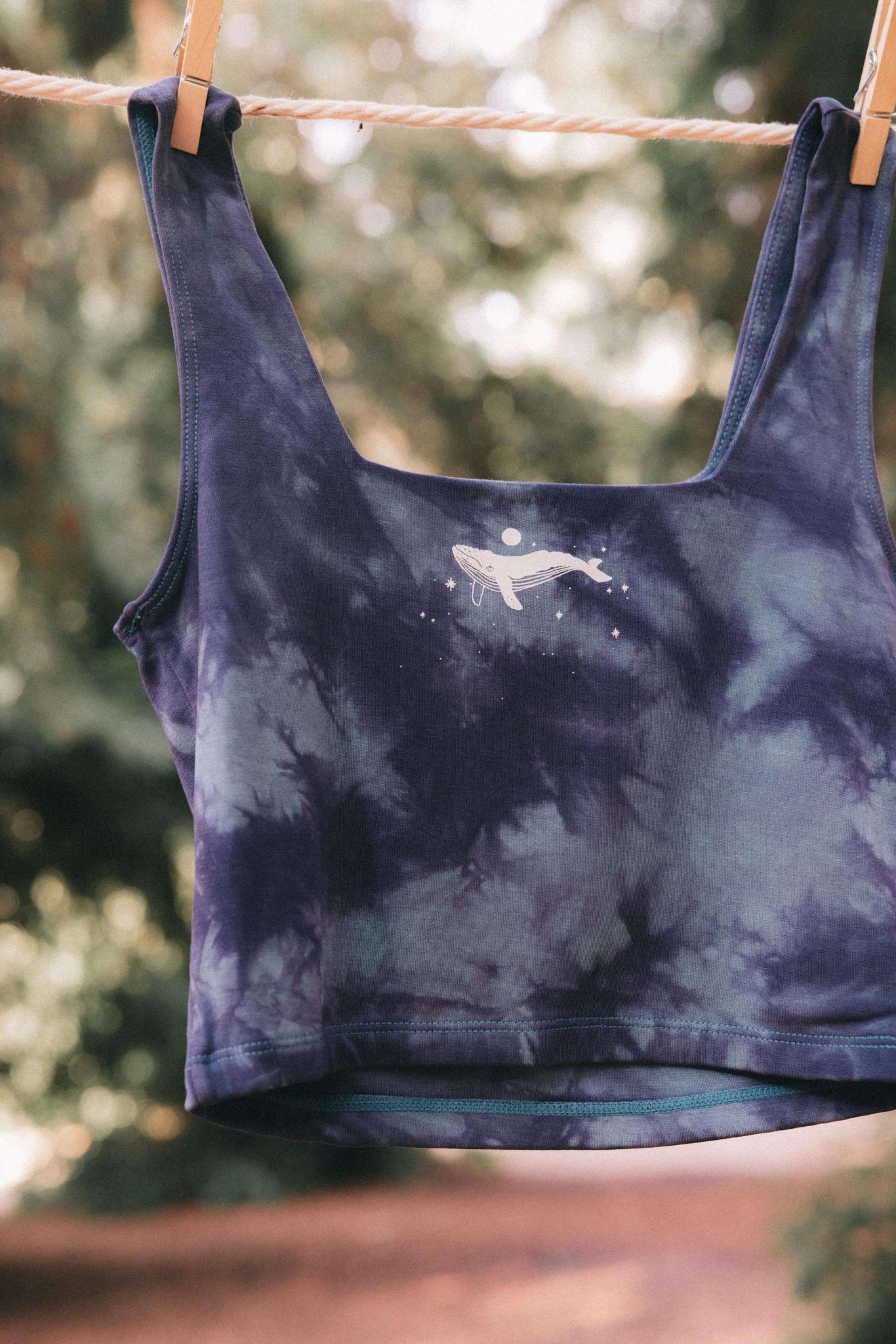 Dyed frozen indigo. White whale, full moon, and stars printed on front. Cut, sewn, dyed, and printed in downtown Los Angeles by small family owned shops where creators are paid more than minimum wage.
