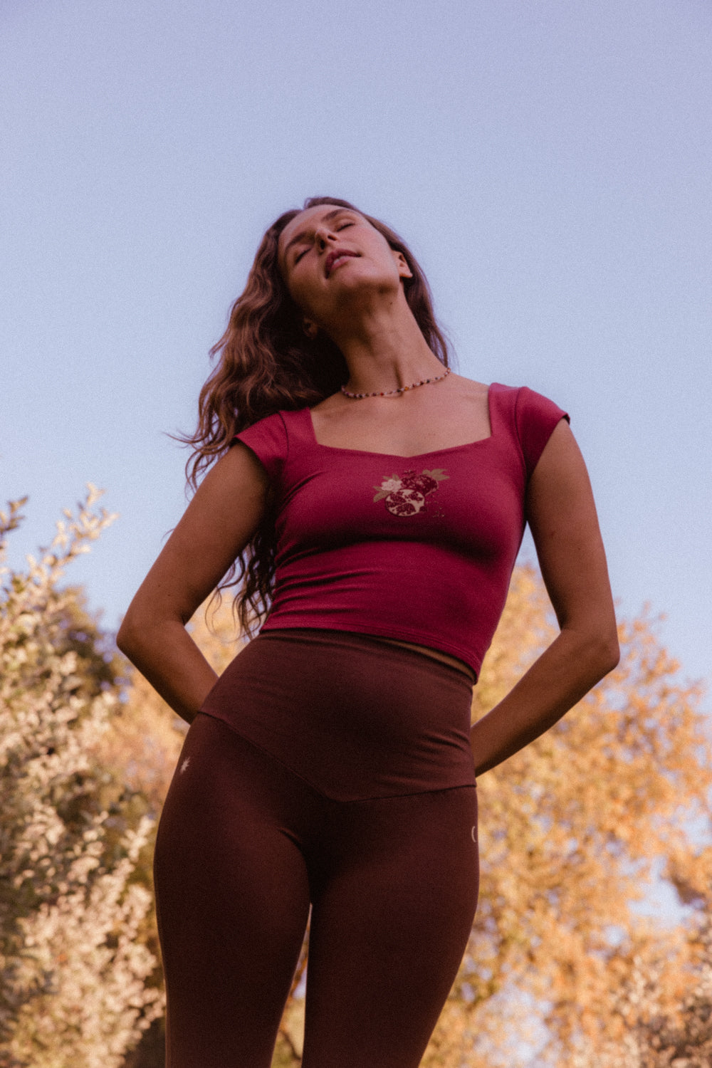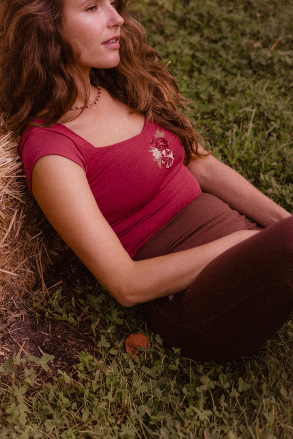 We recommend going up one size. Our fabric stretches beautifully and accommodates your body through pregnancy and beyond. The tops are also breastfeeding-friendly.