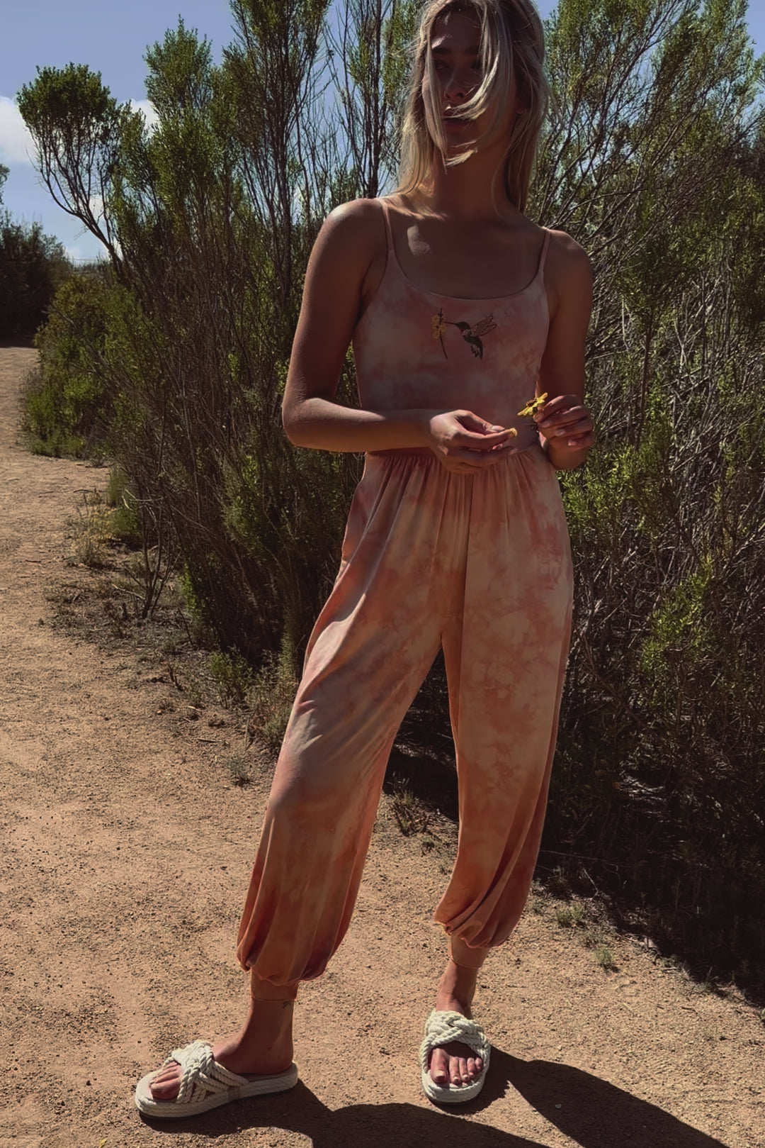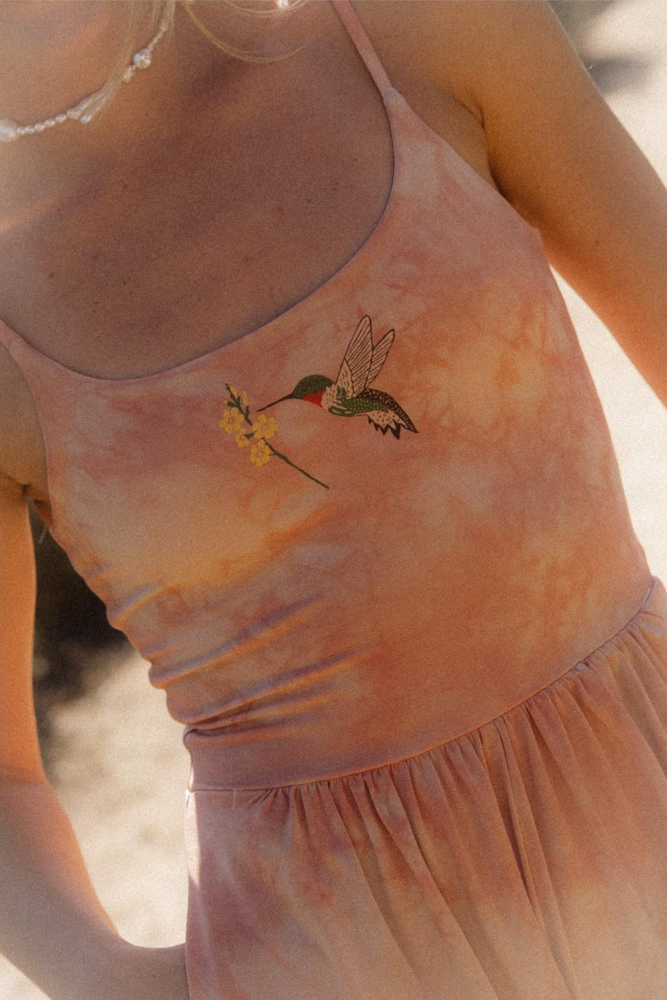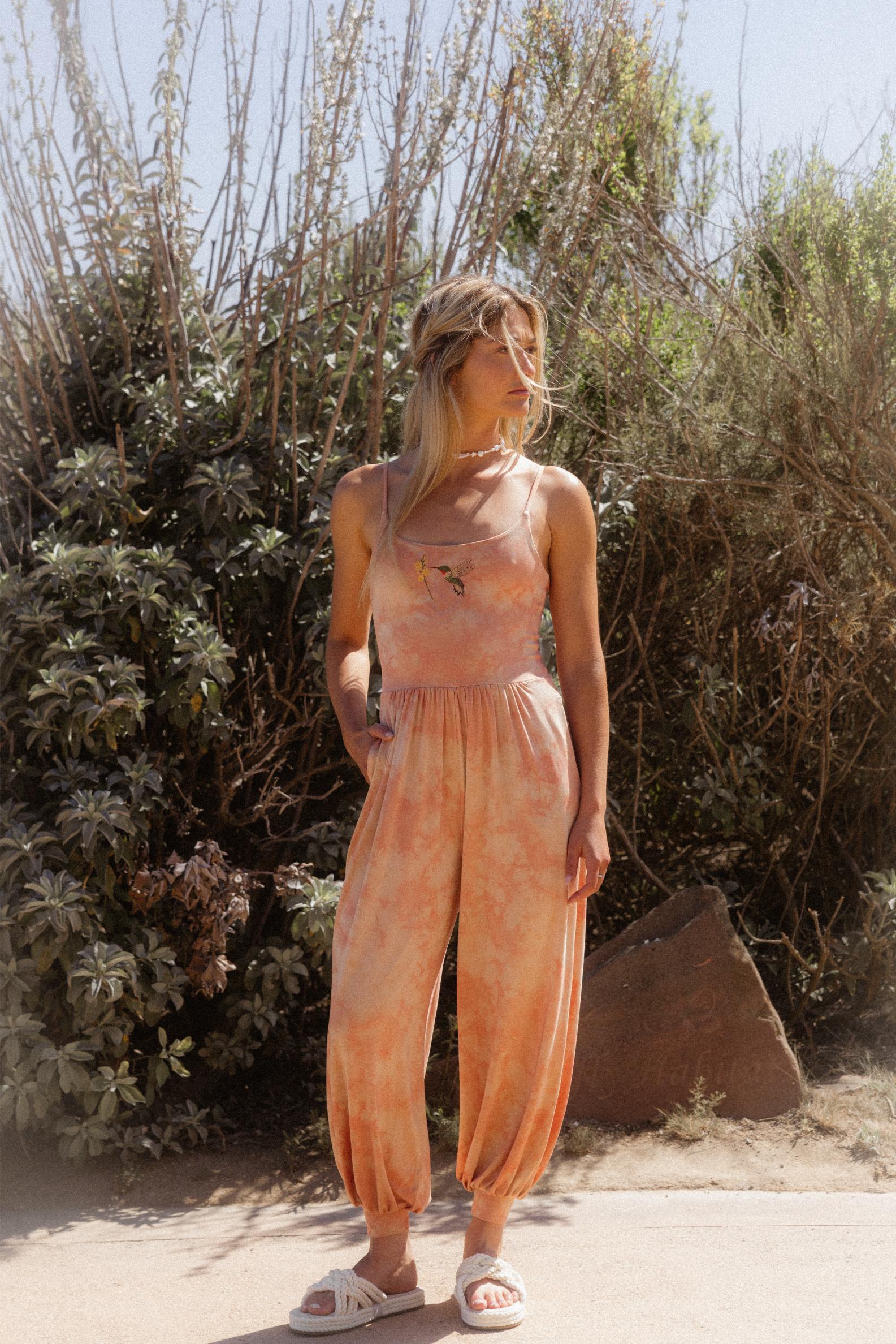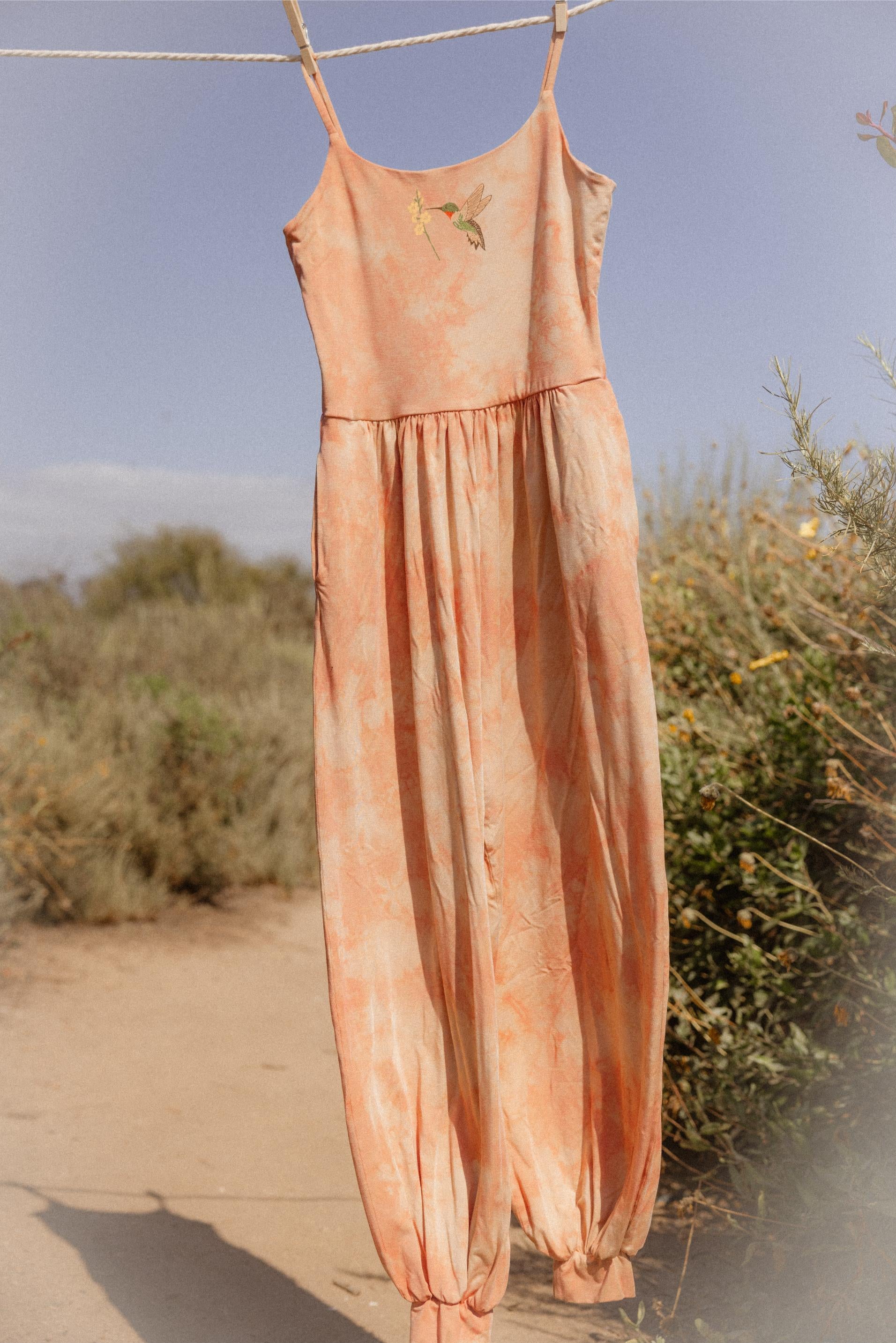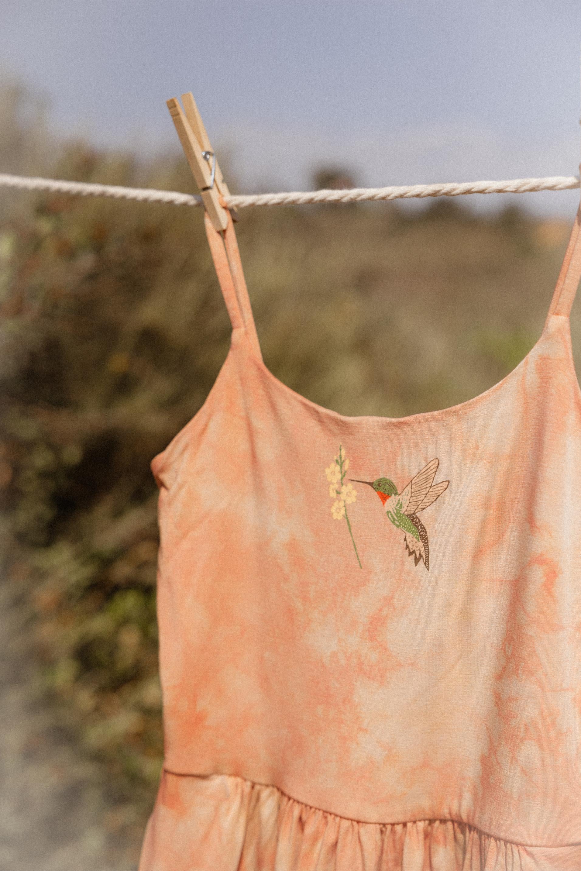 Dyed marbled coral. Hummingbird and flower printed on front. Cut, sewn, dyed, and printed in downtown Los Angeles by small family owned shops where creators are paid more than minimum wage.