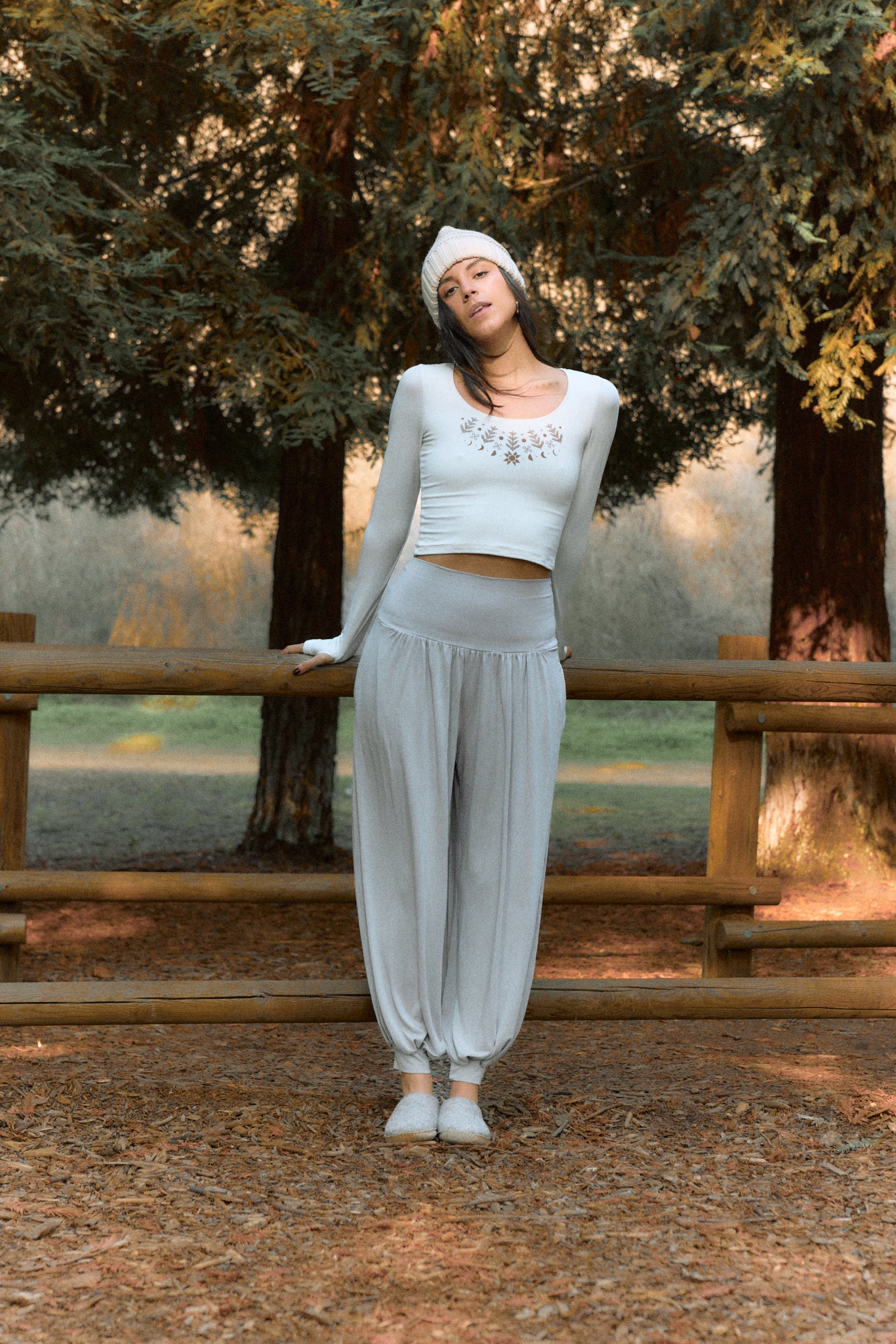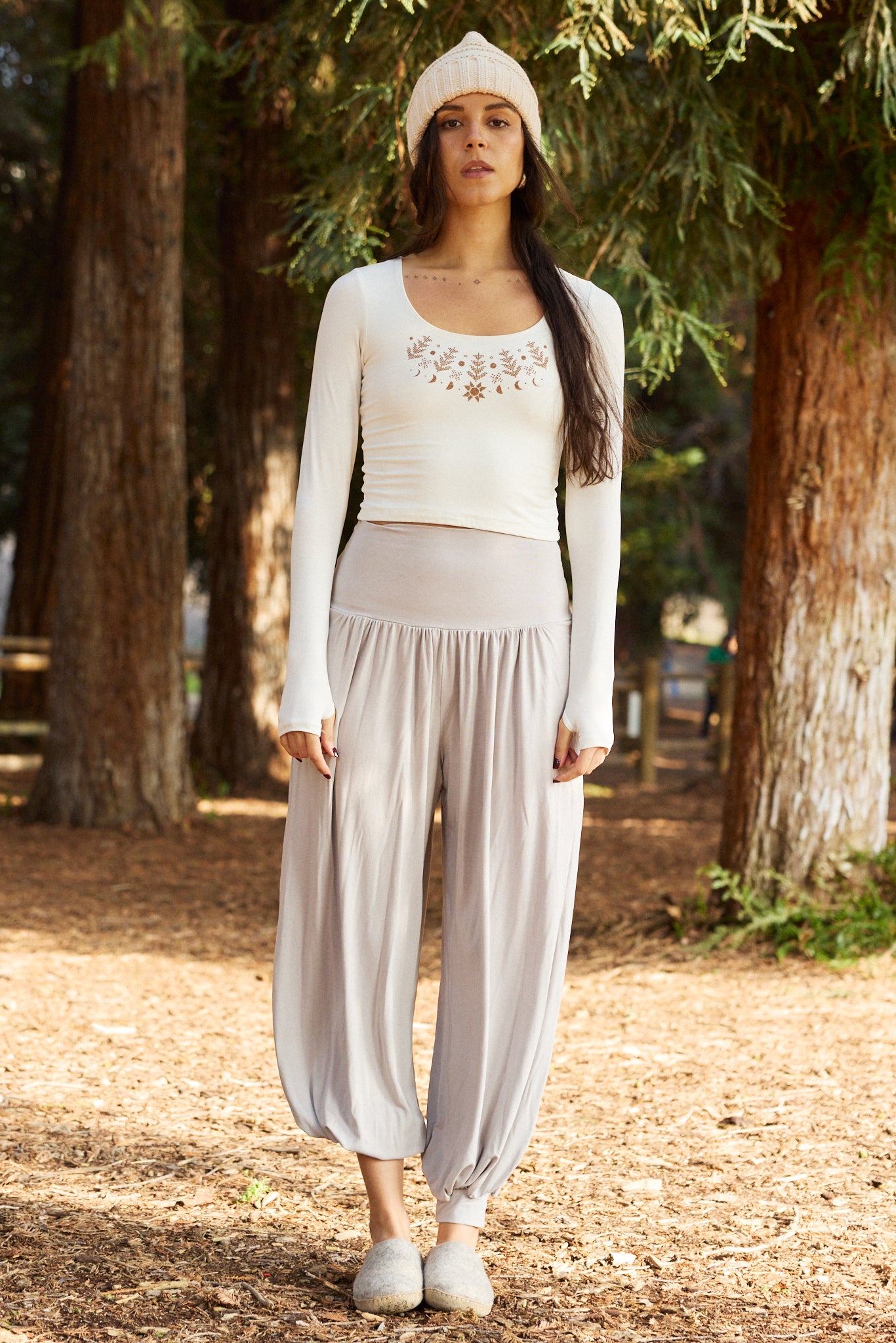 Every piece is made from premium, plant-based or naturally derived fibers selected for softness, breathability, and comfort. Many of our fabrics include TENCEL™ lyocell or other sustainable blends made in small batches. Each garment is dyed and finished in Los Angeles, giving it that signature Purusha feel that is buttery, lived in, and completely unique.