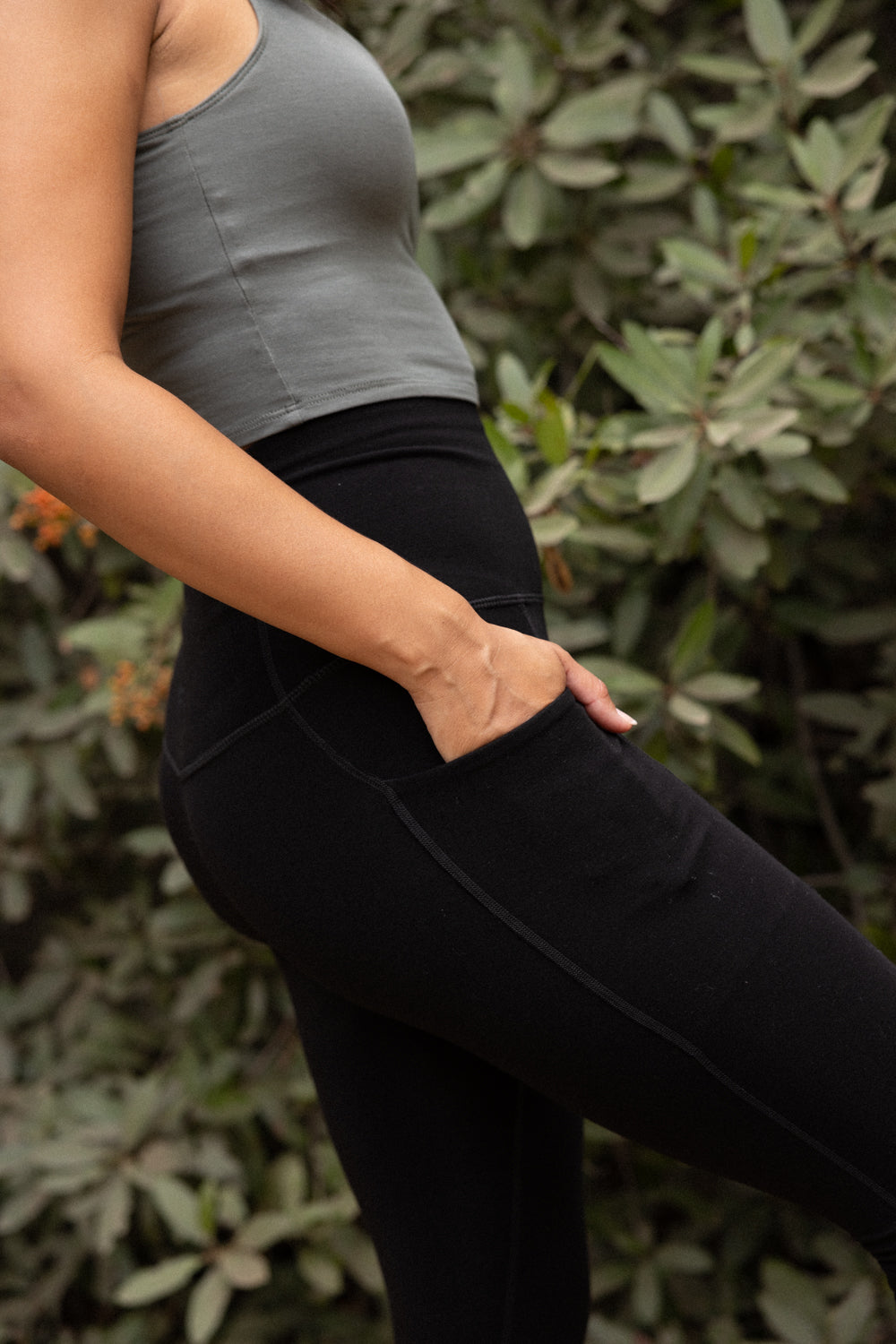 Our pocket leggings have a 27-inch inseam that comfortably stretches to around 29 inches.