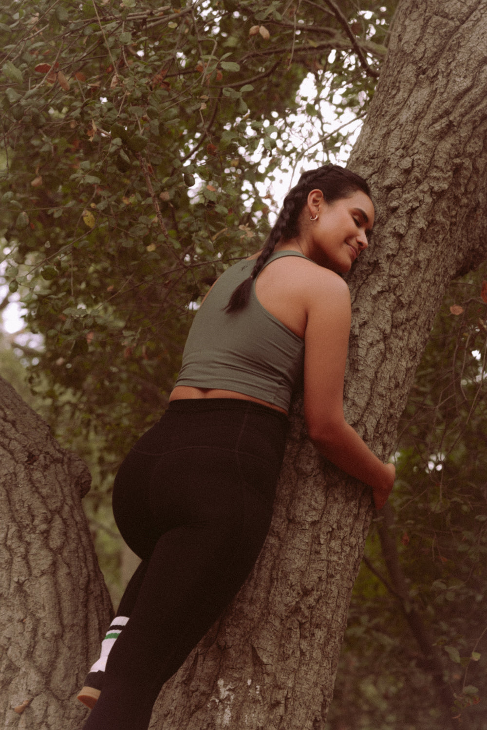 We recommend going up one size. Our fabric stretches beautifully and accommodates your body through pregnancy and beyond. The tops are also breastfeeding-friendly.