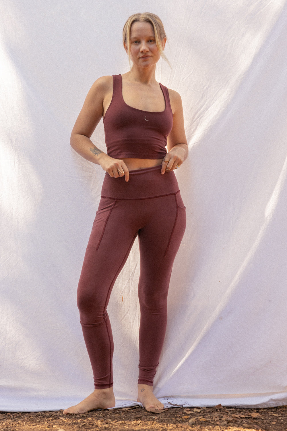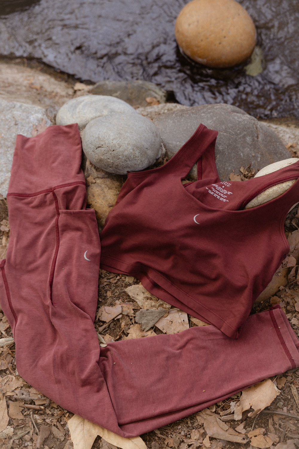 ✿ Garment dyed burgundy hued brown. Please note, the leggings came out about one shade lighter than the top, and has a garment dye hand and look.