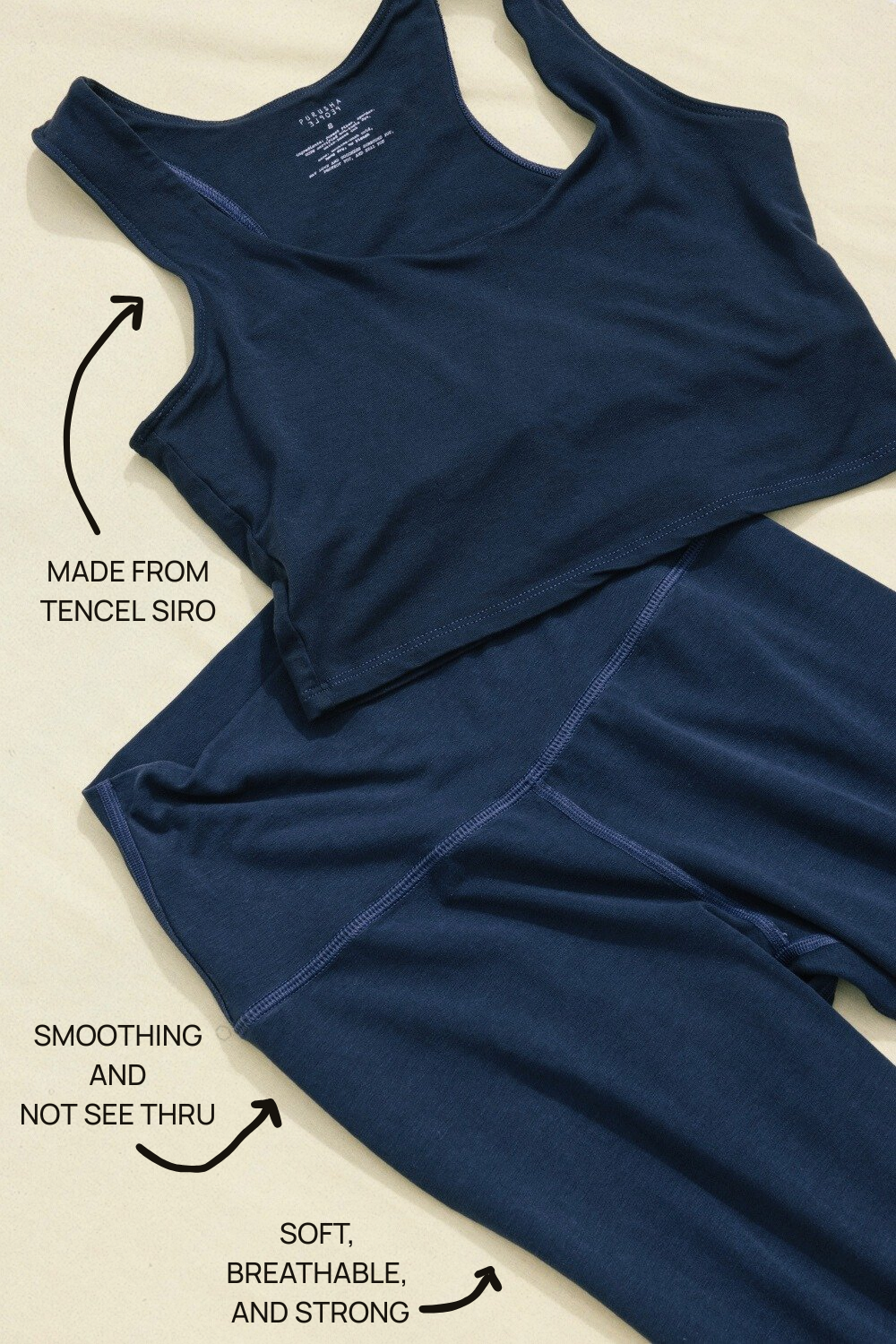 We use plant-based fabrics like TENCEL™ lyocell, ECOVERO™ viscose, and organic cotton, blended with Creora® bio-based spandex for gentle stretch. While the spandex still contains some petroleum, it’s partially derived from renewable sources—making it a better option than traditional synthetics. The result: soft, breathable, lower-impact clothing that feels as good as it is.