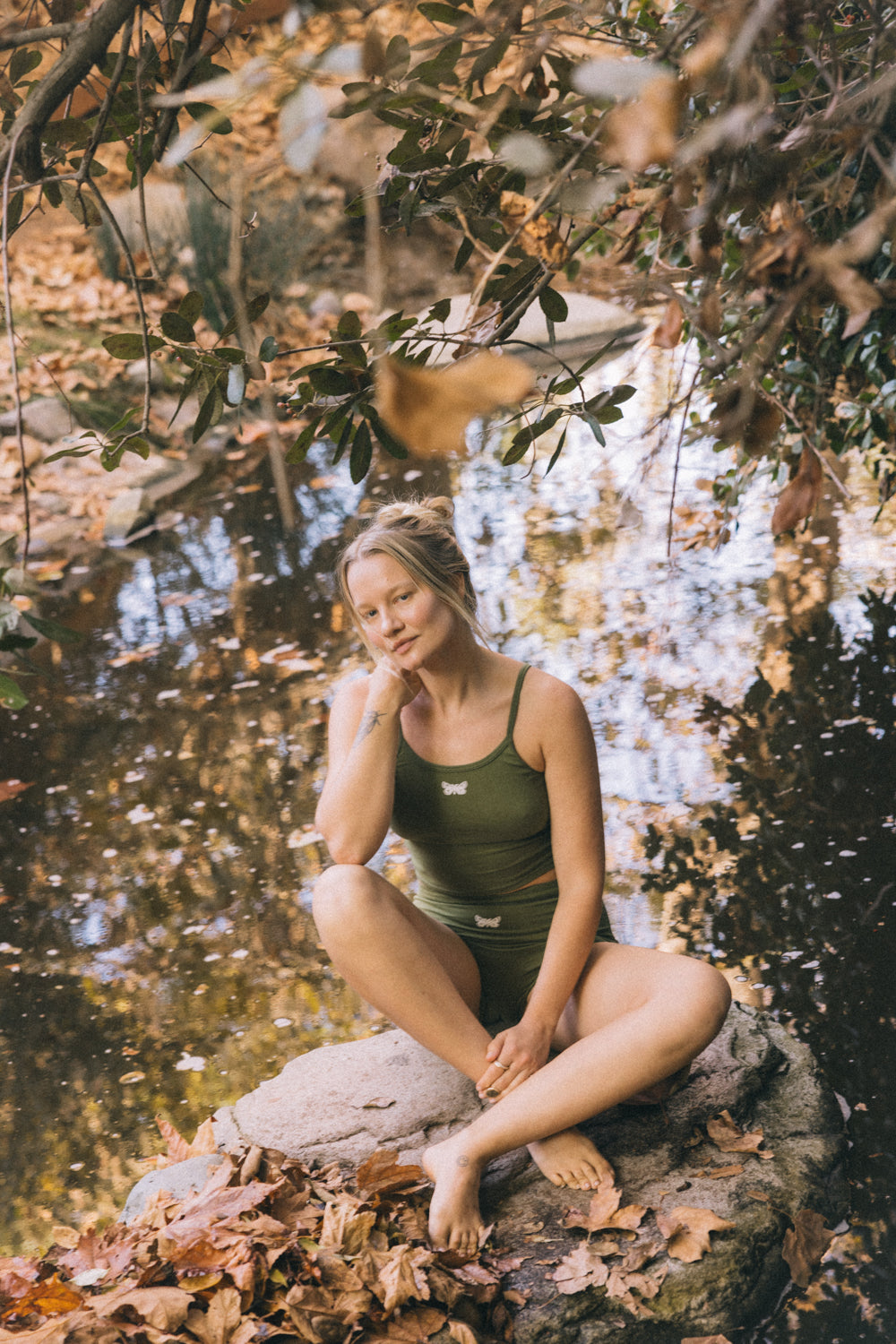We knit our fabrics in Los Angeles, work with a GOTS-certified dye house, and print exclusively with water-based inks. Every design is created in collaboration with female artists, and all of our production partners are small, family-owned studios located within a 25-mile radius of downtown LA, bringing our vision to life with care and integrity.