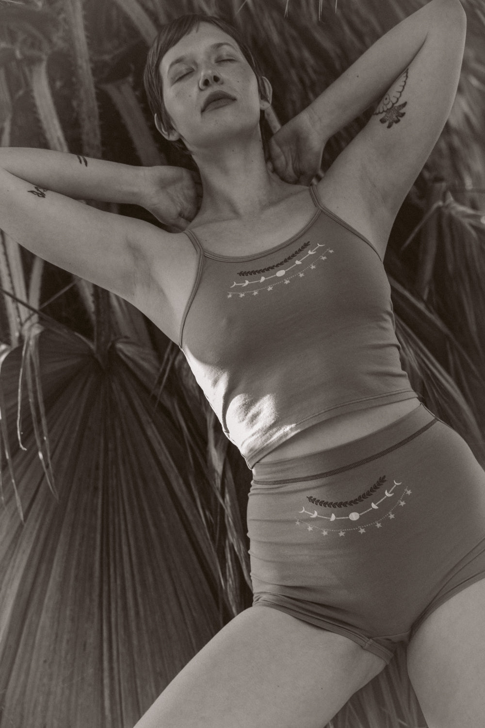 We knit our fabrics in Los Angeles, work with a GOTS-certified dye house, and print exclusively with water-based inks. Every design is created in collaboration with female artists, and all of our production partners are small, family-owned studios located within a 25-mile radius of downtown LA, bringing our vision to life with care and integrity.