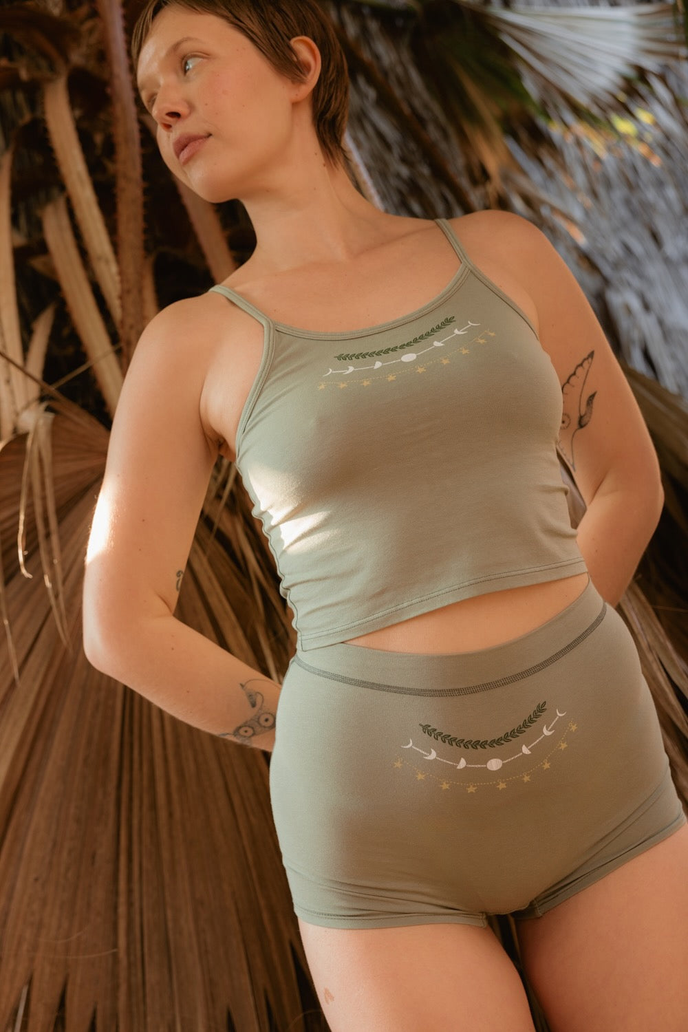 We use plant-based fabrics like TENCEL™ lyocell, ECOVERO™ viscose, and organic cotton, blended with Creora® bio-based spandex for gentle stretch. While the spandex still contains some petroleum, it’s partially derived from renewable sources—making it a better option than traditional synthetics. The result: soft, breathable, lower-impact clothing that feels as good as it is.
