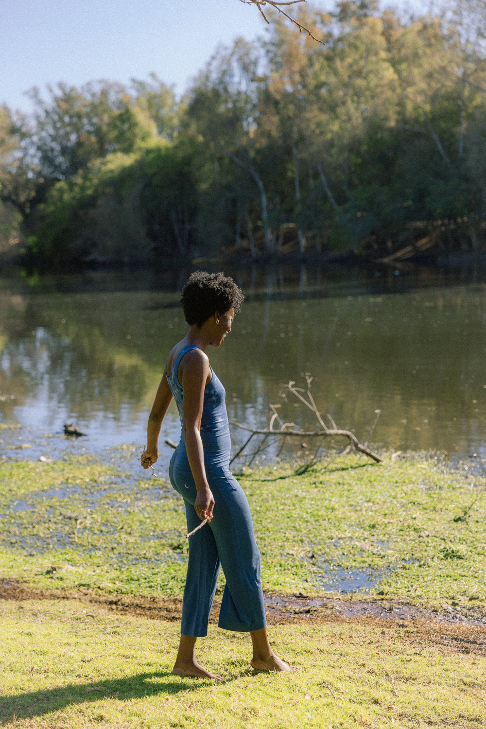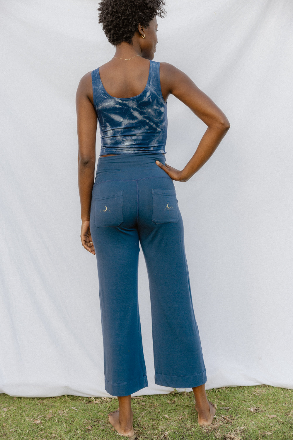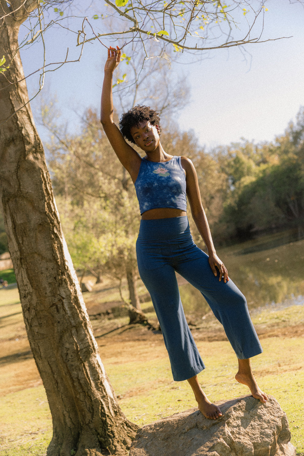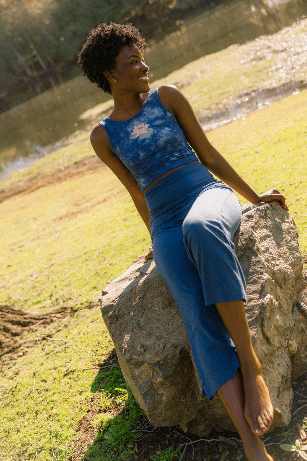 We use plant-based fabrics like TENCEL™ lyocell, ECOVERO™ viscose, and organic cotton, blended with Creora® bio-based spandex for gentle stretch. While the spandex still contains some petroleum, it’s partially derived from renewable sources—making it a better option than traditional synthetics. The result: soft, breathable, lower-impact clothing that feels as good as it is.
